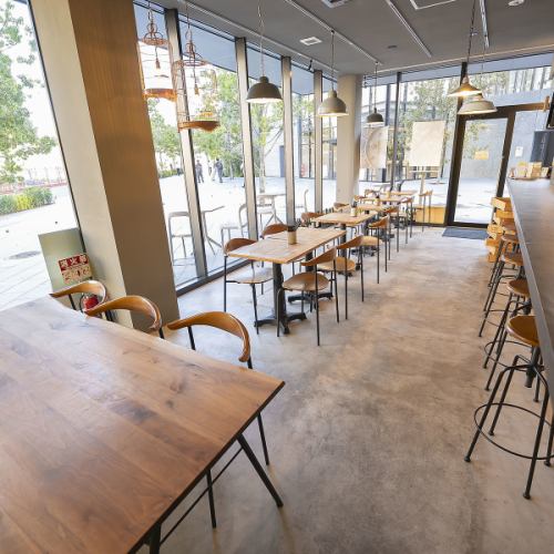 【テーブル席】黄色い壁とガラス張りが印象的な、明るく開放的なテーブル席をご用意しました!友人や家族とのお食事にぴったりな、ゆったりとした空間です。自然豊かな公園内に佇む当店で、心安らぐひとときをお過ごしください。女子会や記念日など、様々なシーンにおすすめです♪